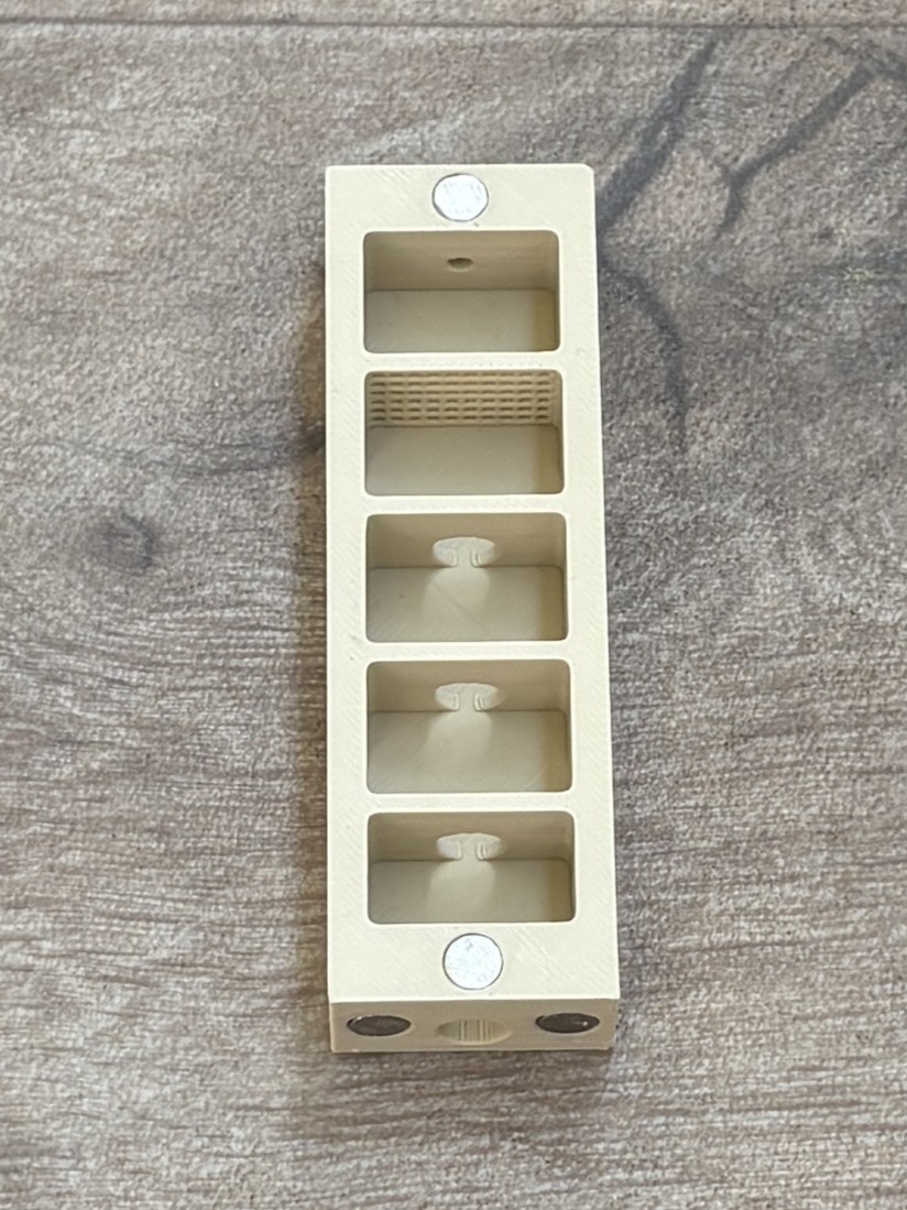 | The magnet alignment tool helps you insert magnets with the correct polarity. This ensures that all modules attract each other instead of repelling, which is essential for the system to work properly. Using this tool makes the assembly process much easier and prevents mistakes when installing the magnets. You can download the magnet alignment tool here: https://makerworld.com/de/models/2491263-magnet-pole-checker#profileId-2737610 |